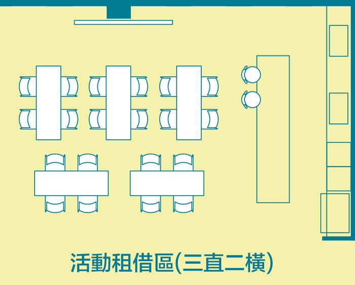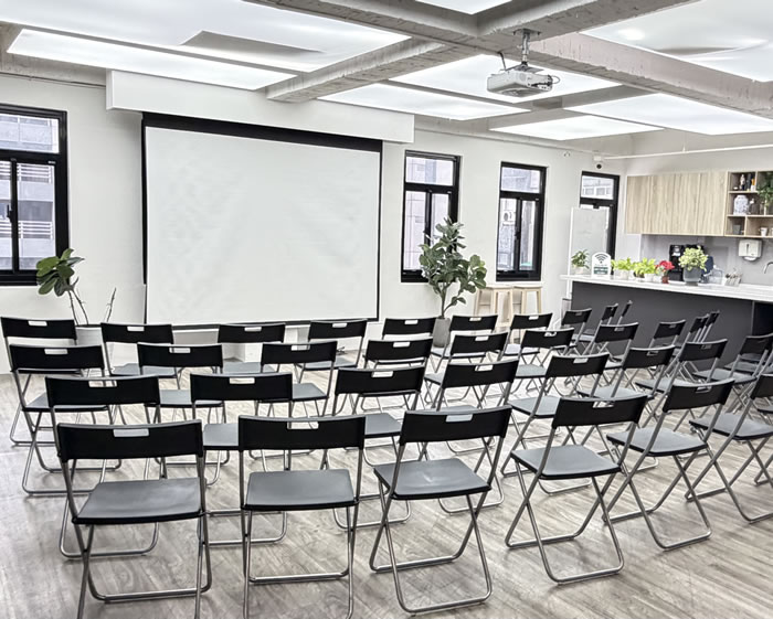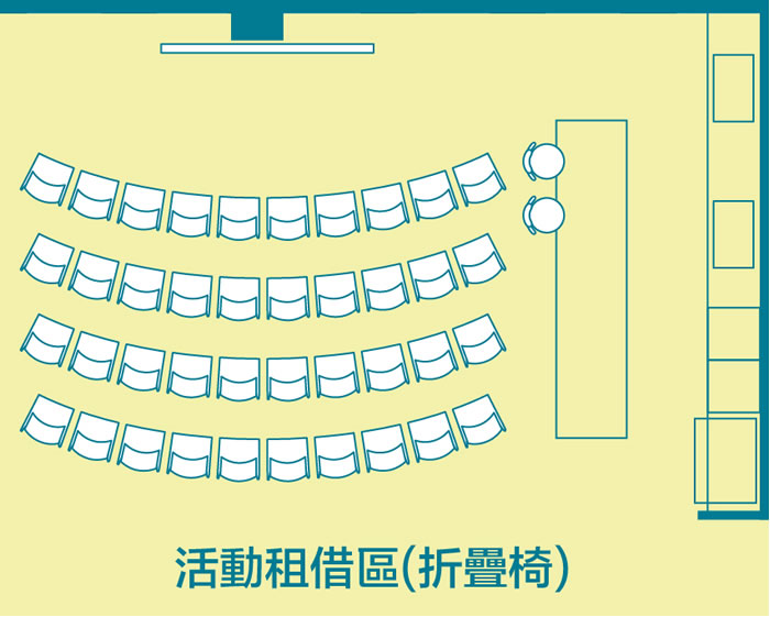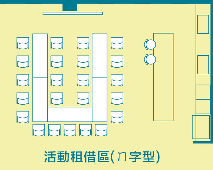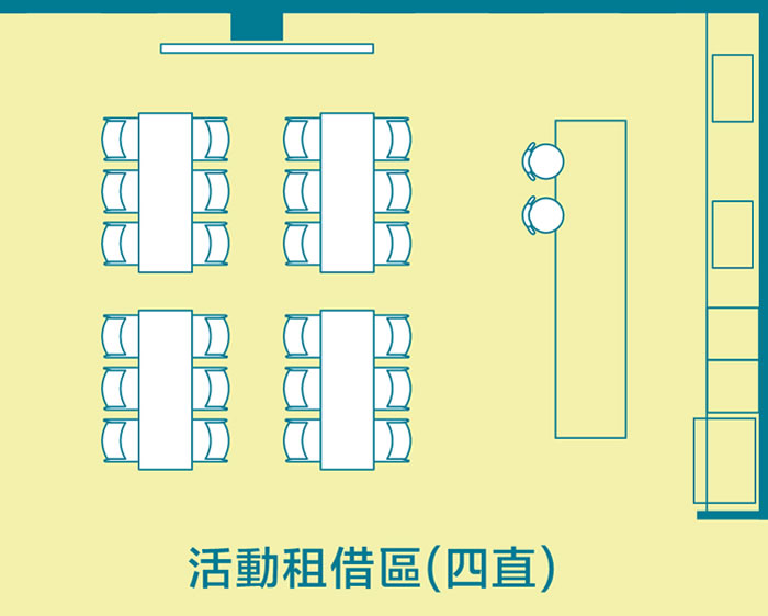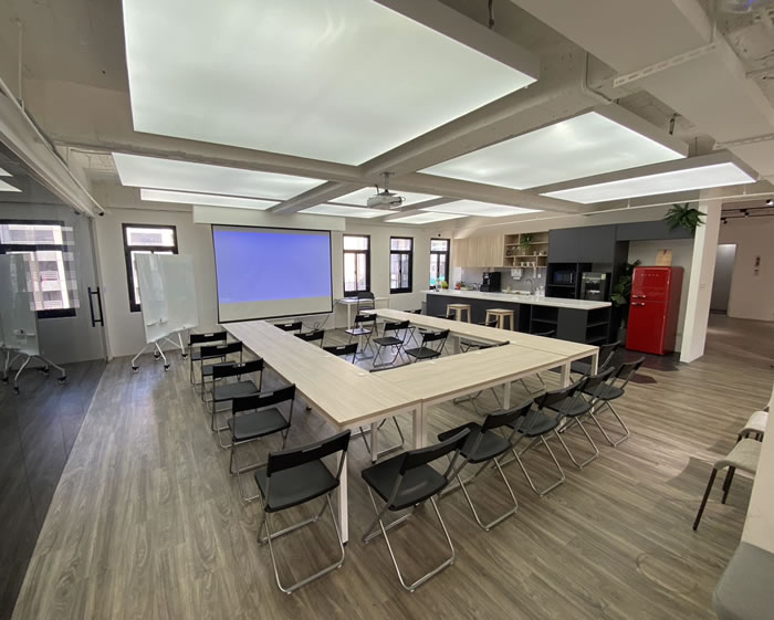 | 免費使用項目 | 電視螢幕 中島 投影機 音響 麥克風 白板 吧台區免費使用(咖啡&茶水) 客製化桌椅排列(黑色折疊凳X50) QR-CODE進出管理系統 |